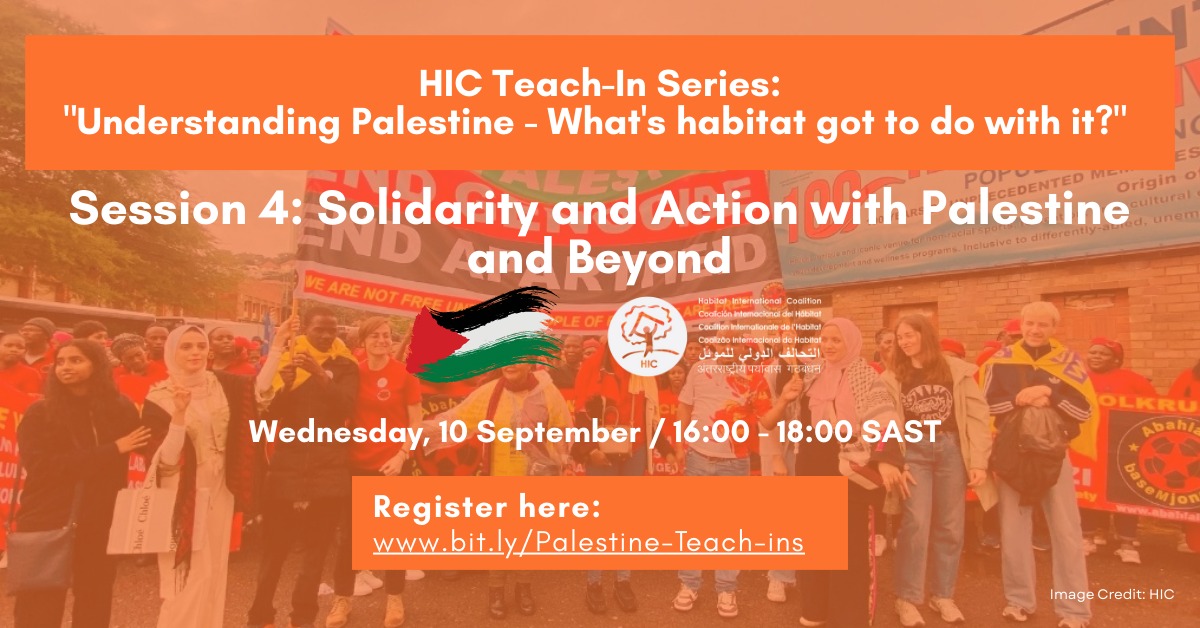 Held between August and September 2025, the HIC “Understanding Palestine” teach-in series allowed for the HIC membership to learn more about the story of Palestine from a habitat perspective, strengthening our collective understanding and collectively reflecting on manners to further support the Palestinian People and bring an end to the illegal situation. The term “teach-in” was coined during the Vietnam War, when educational sit-in protests were held on college campuses as a form of learning and peaceful resistance. These forums seek to encourage critical thinking and collective action through open discussion and debate.